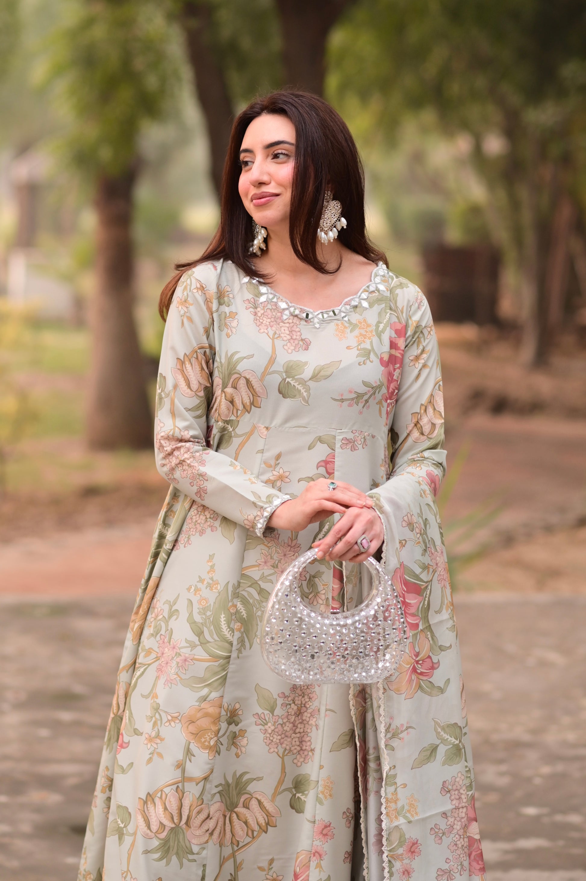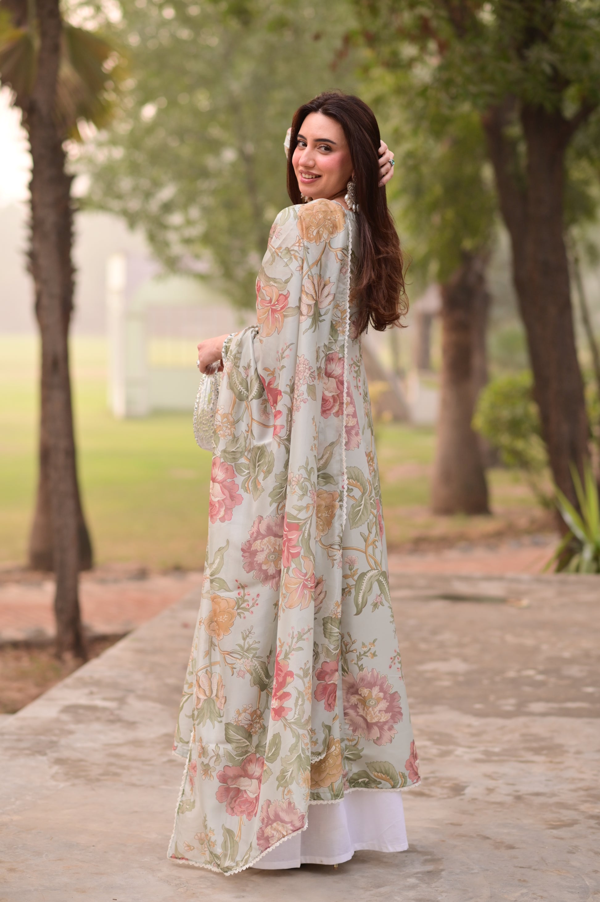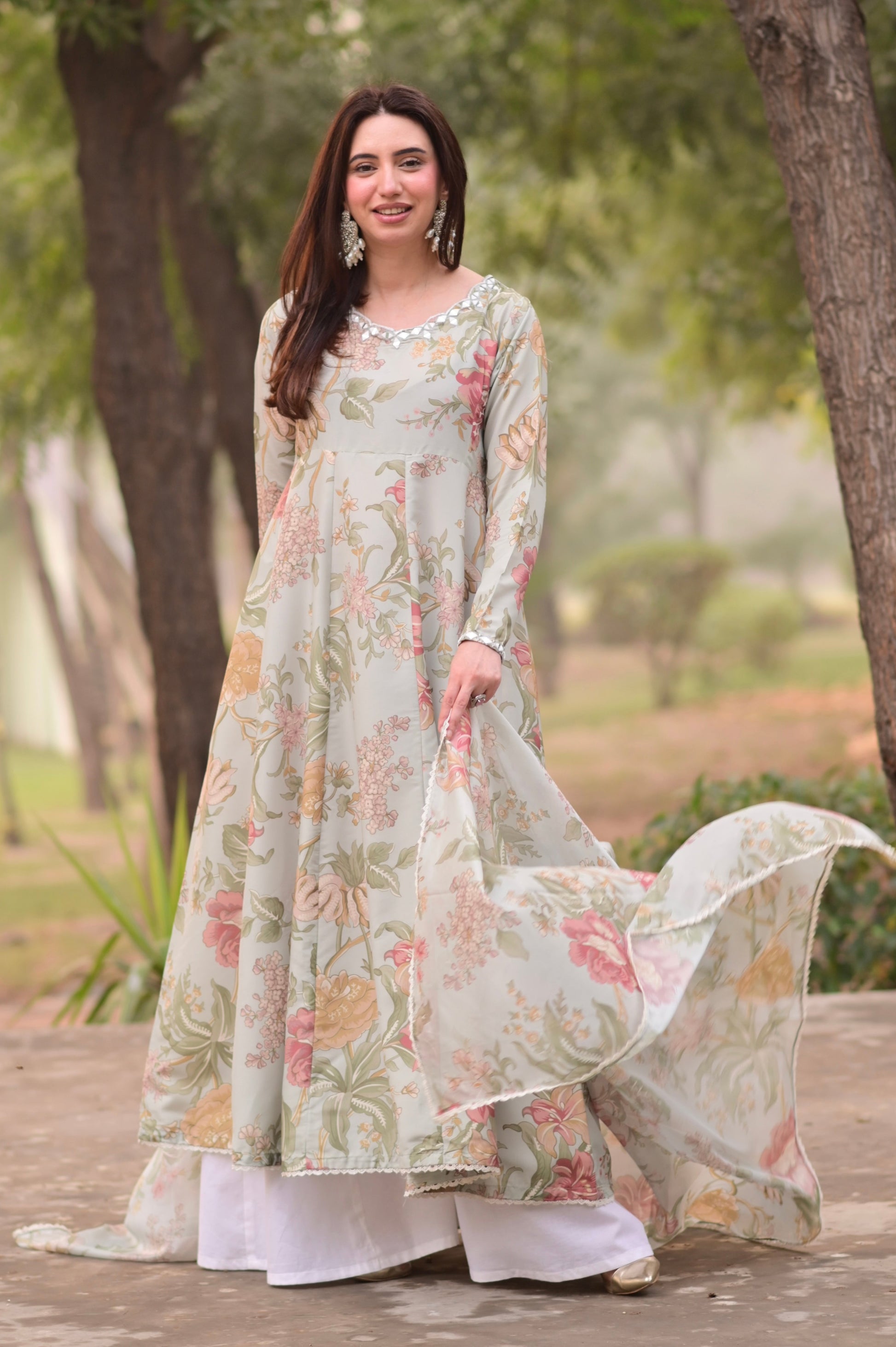 A vibrant floral canvas sets the mood for this dreamy kalidar frock, with an embroidered neckline with sheesha work in scallop shape. Embroidery and sheesha work on the sleeves and a white matching palazzo complete this look. A breezy matching printed dupatta adds an elevated feel completed by lace on all four sides.