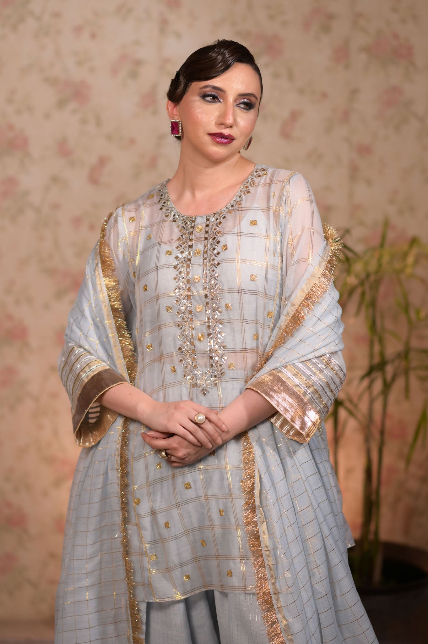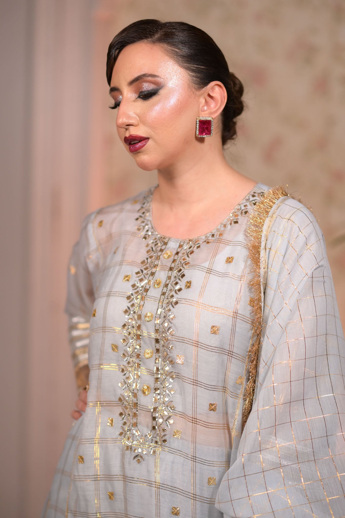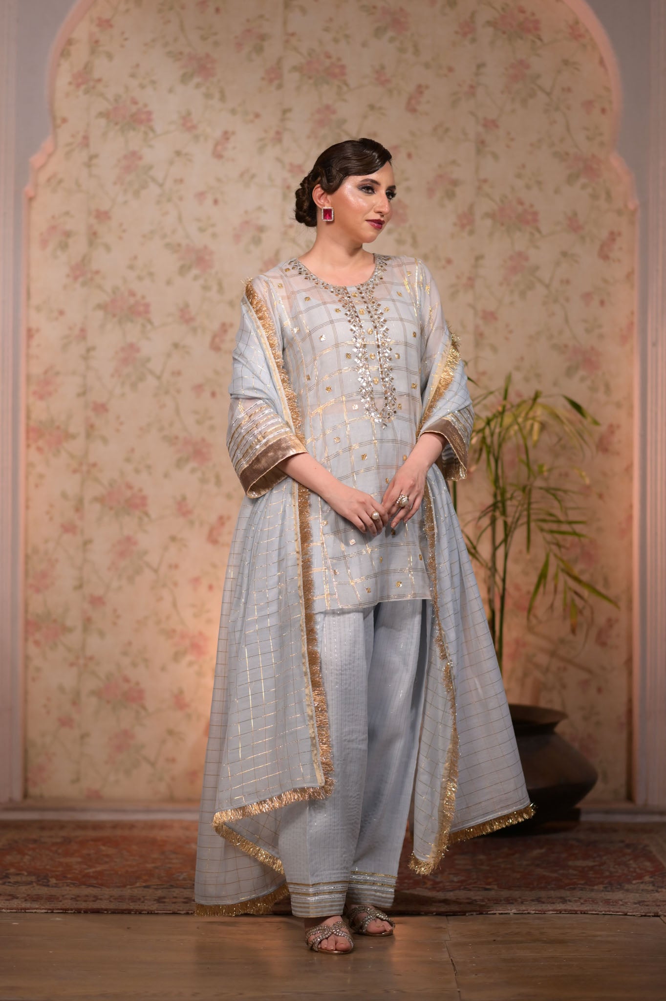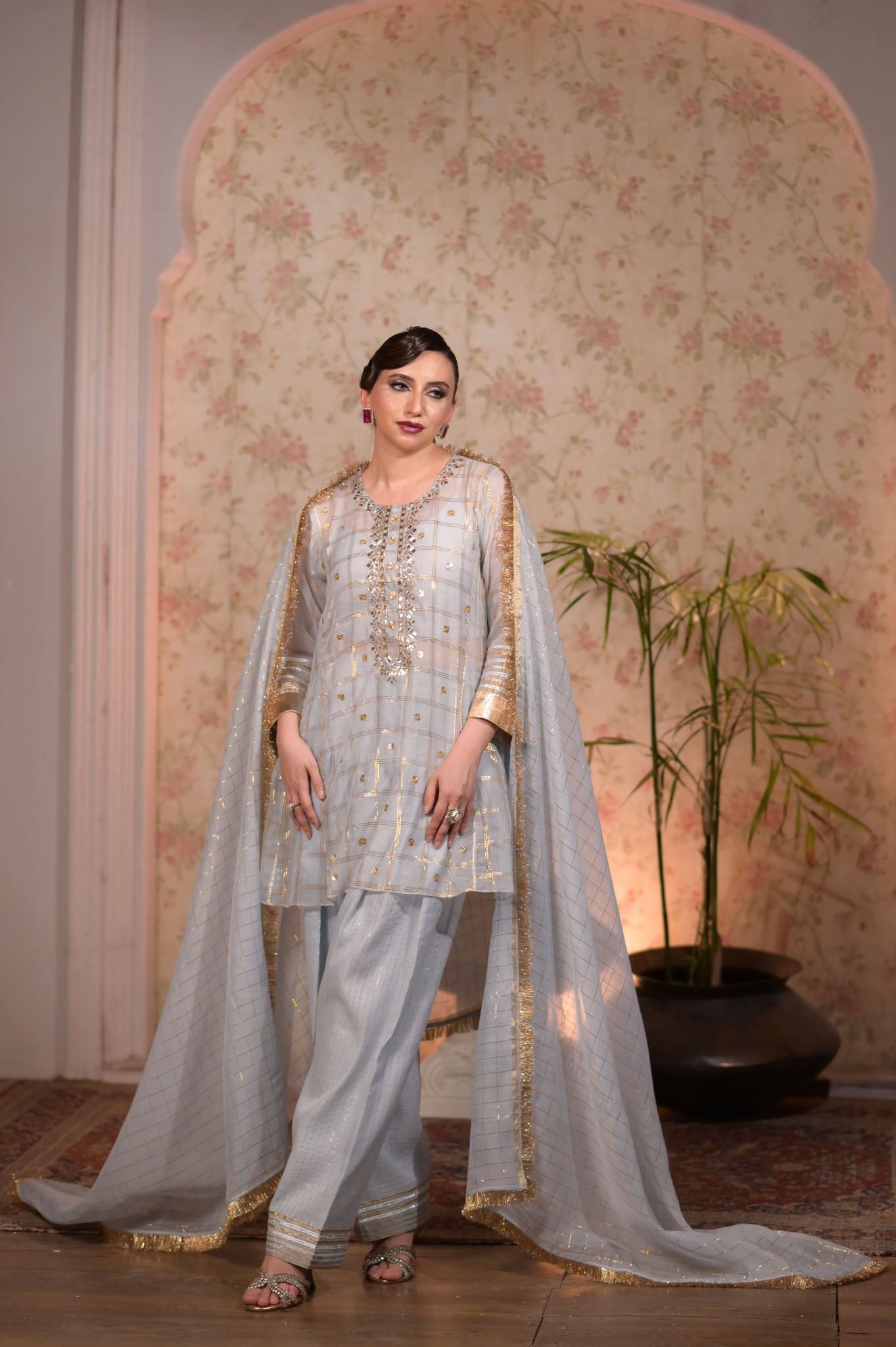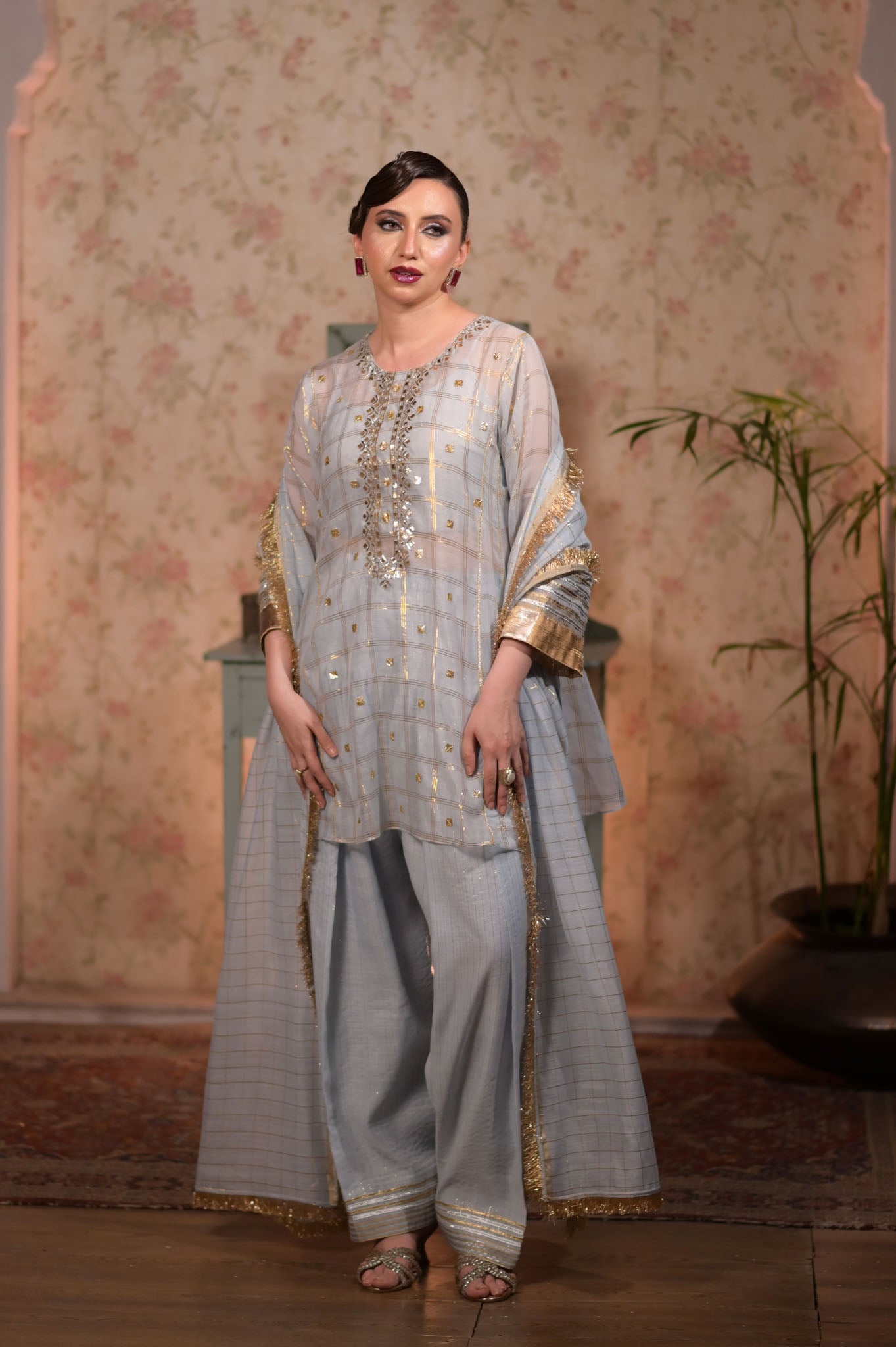 Artisan's special mukaish and gota shirt with shalwar. Dupatta with suchi kiren.