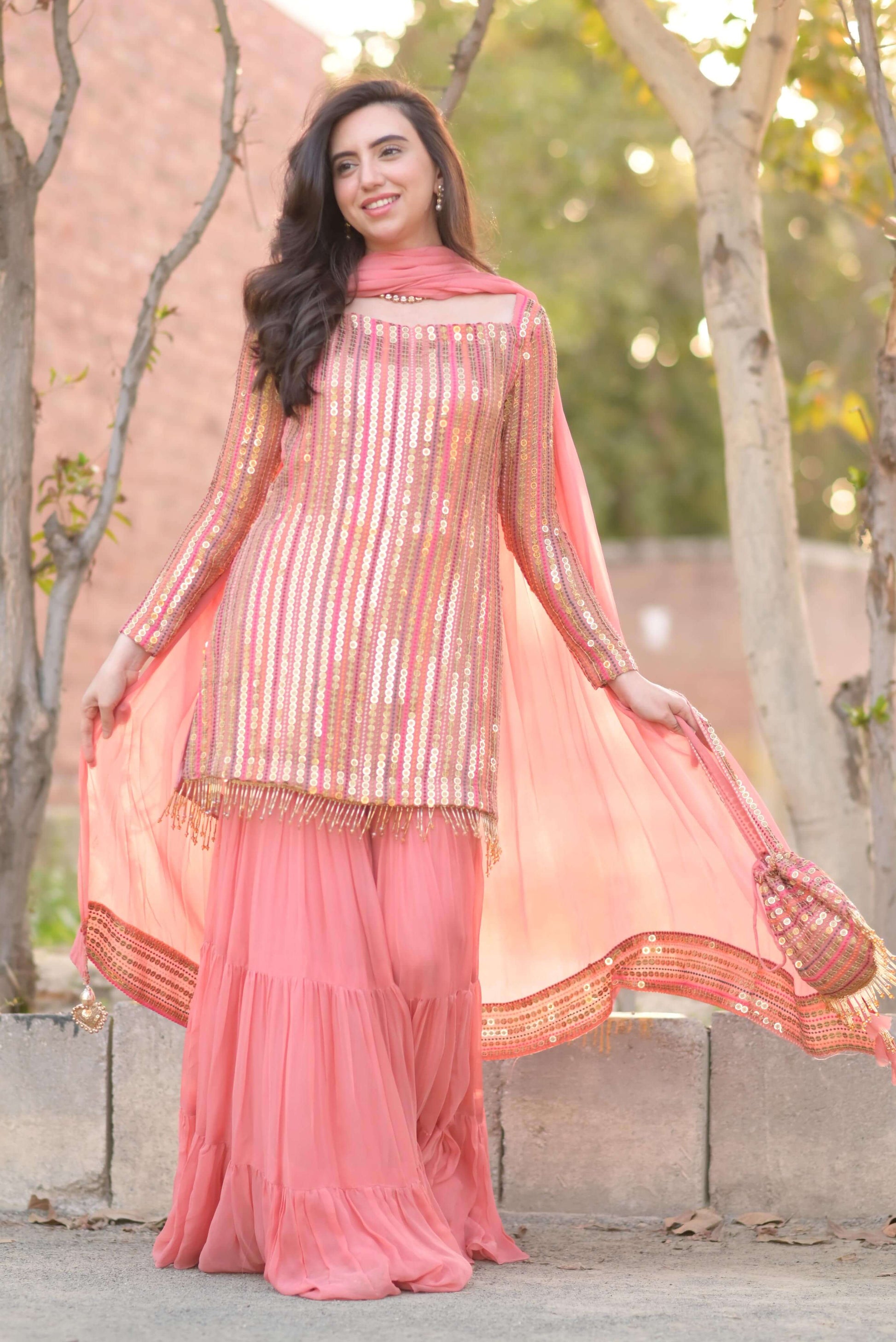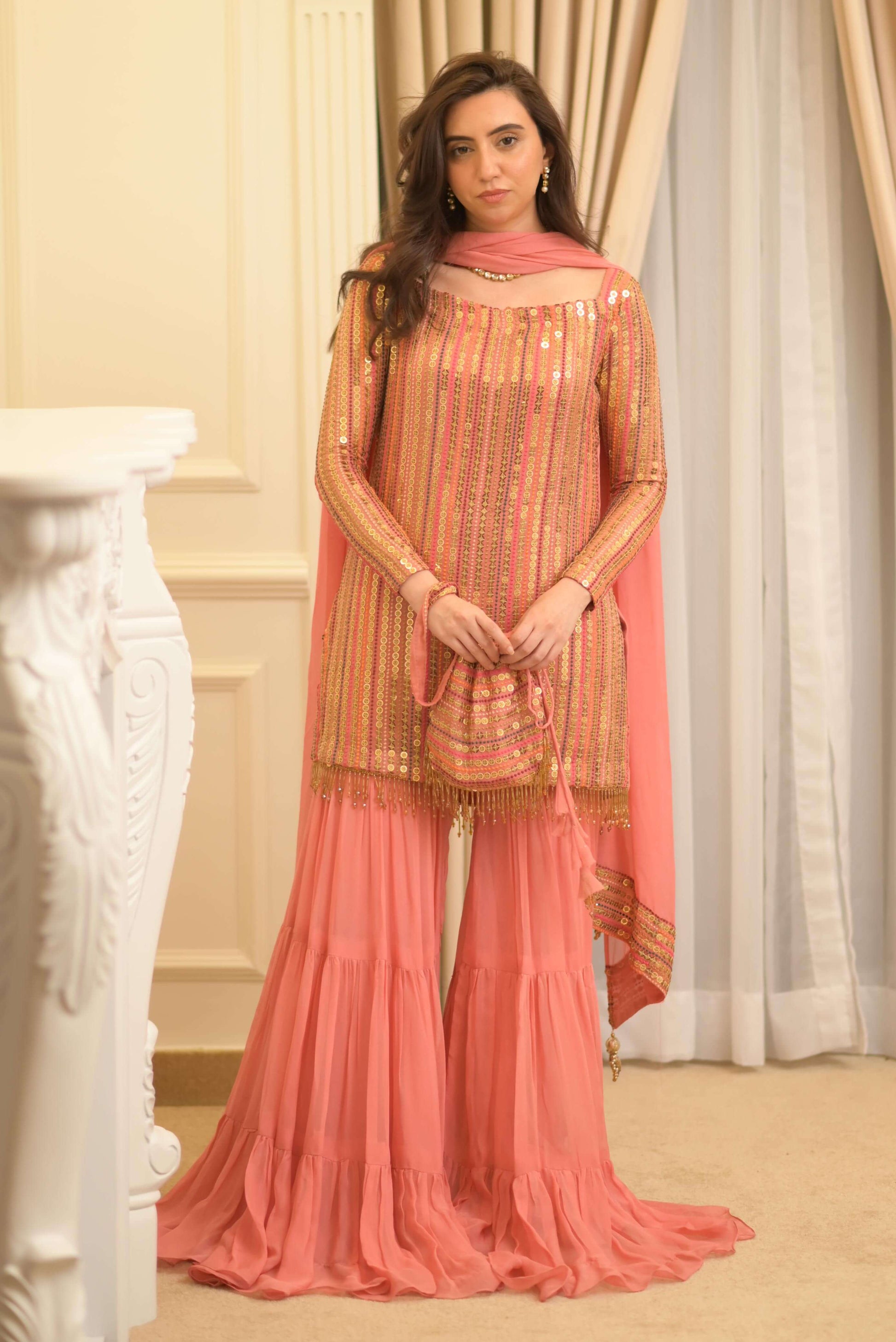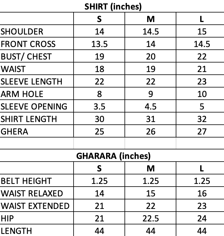 Includes: Shirt, Mexican Gharara, Dupatta & Potli Shirt