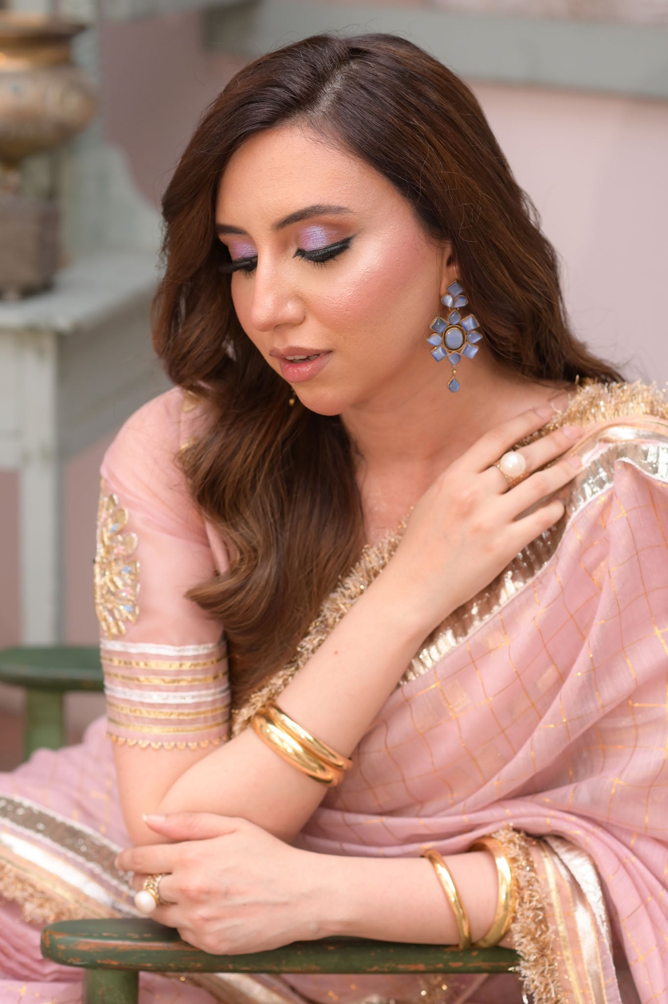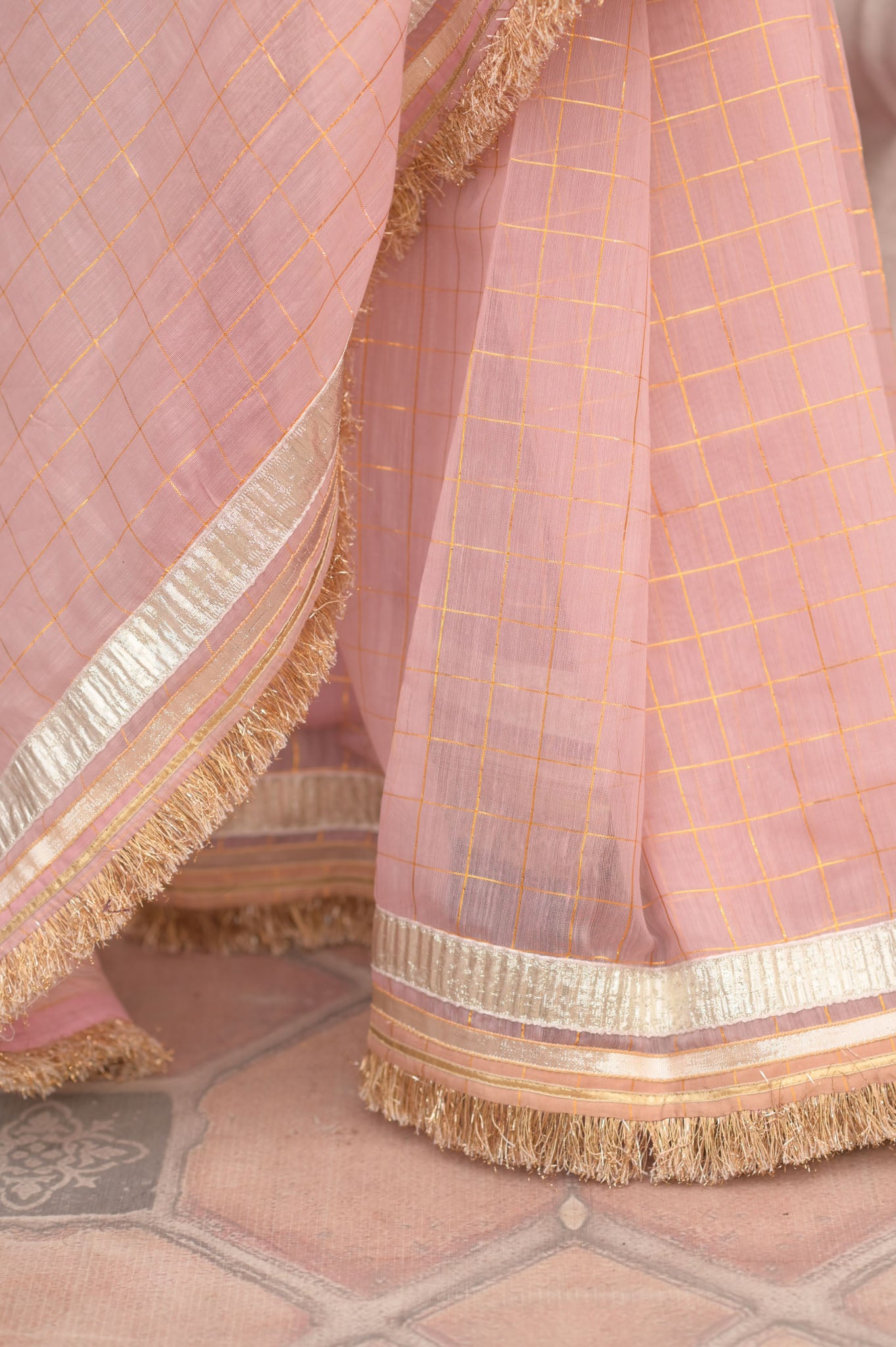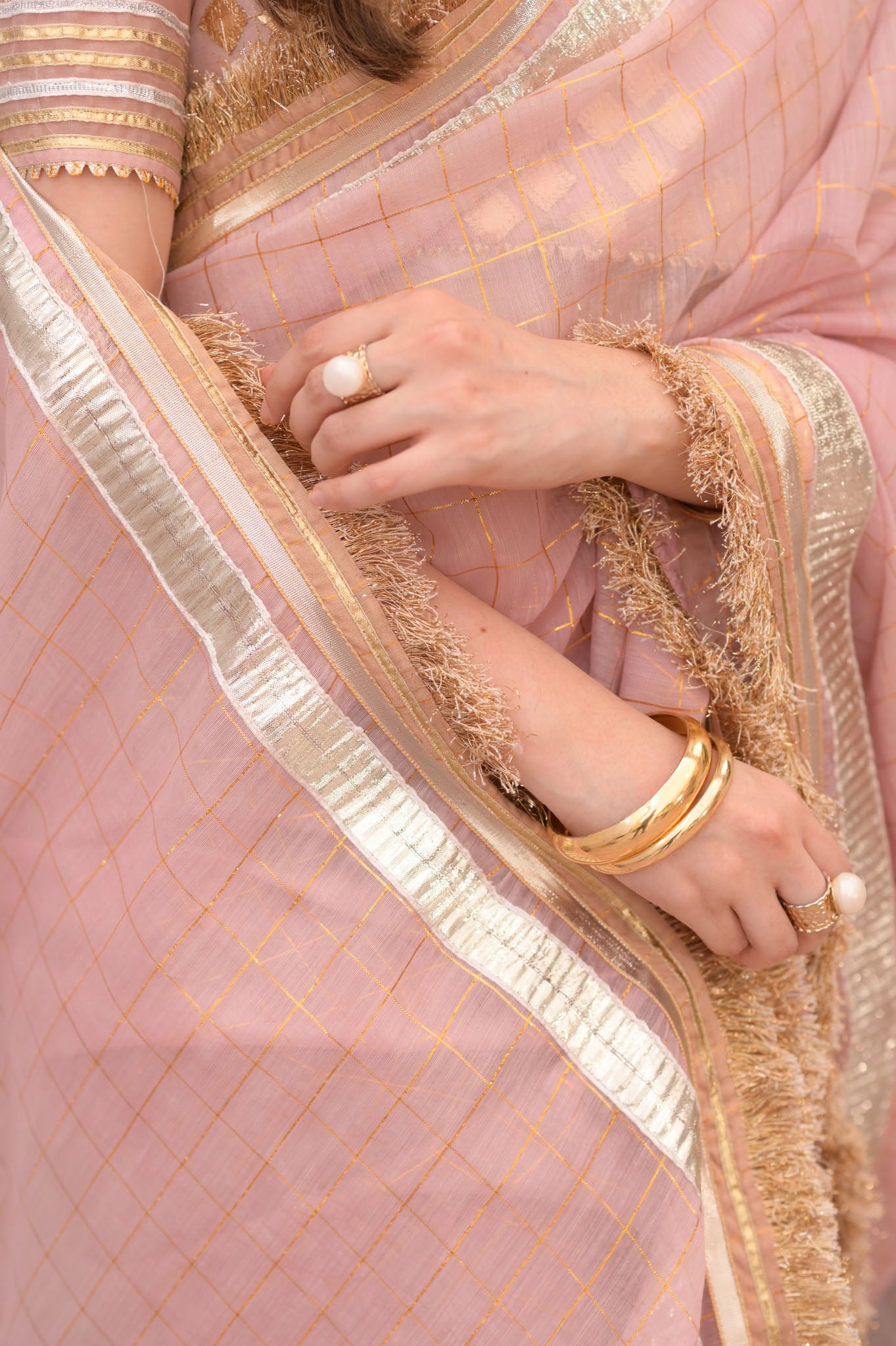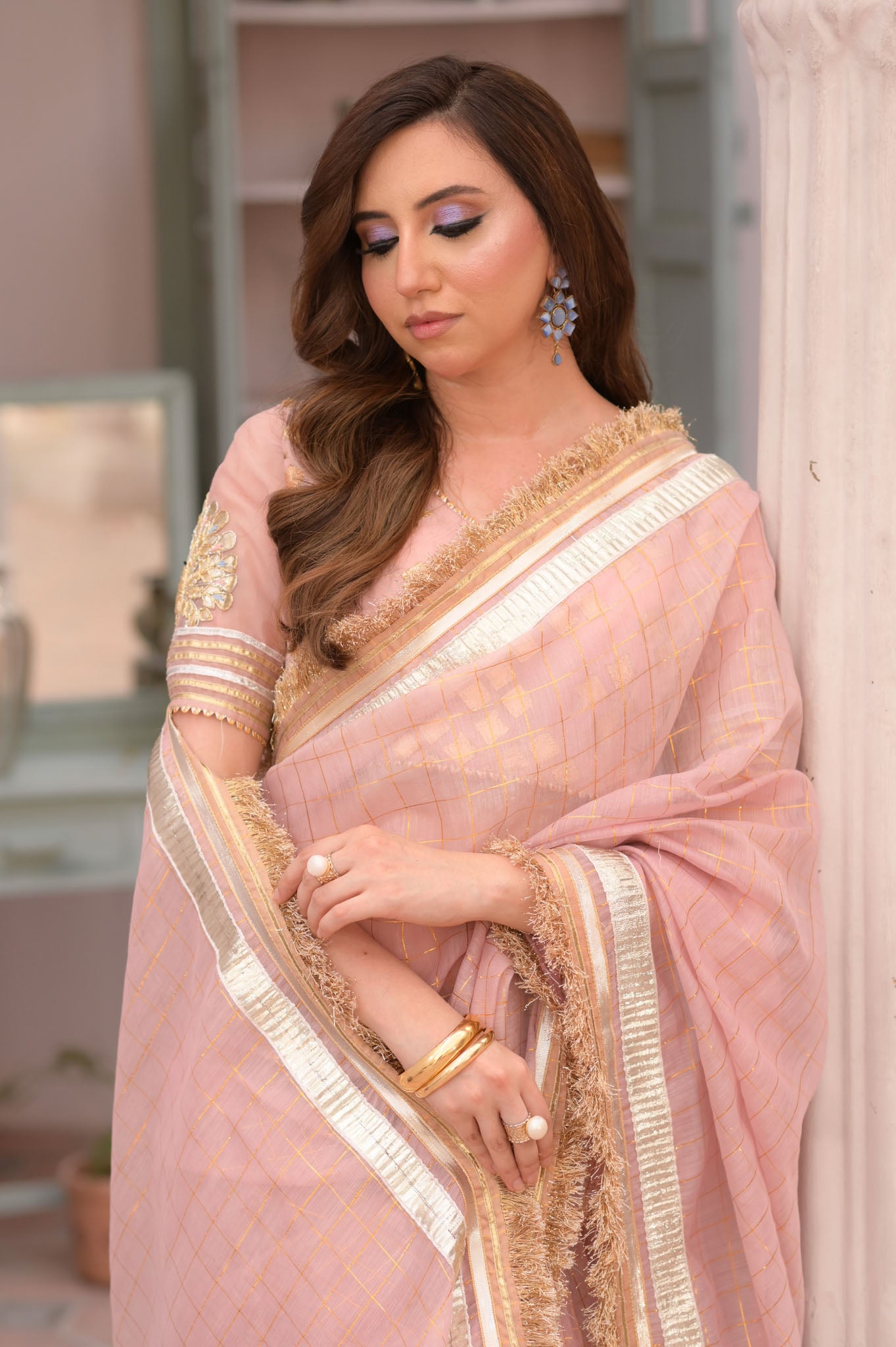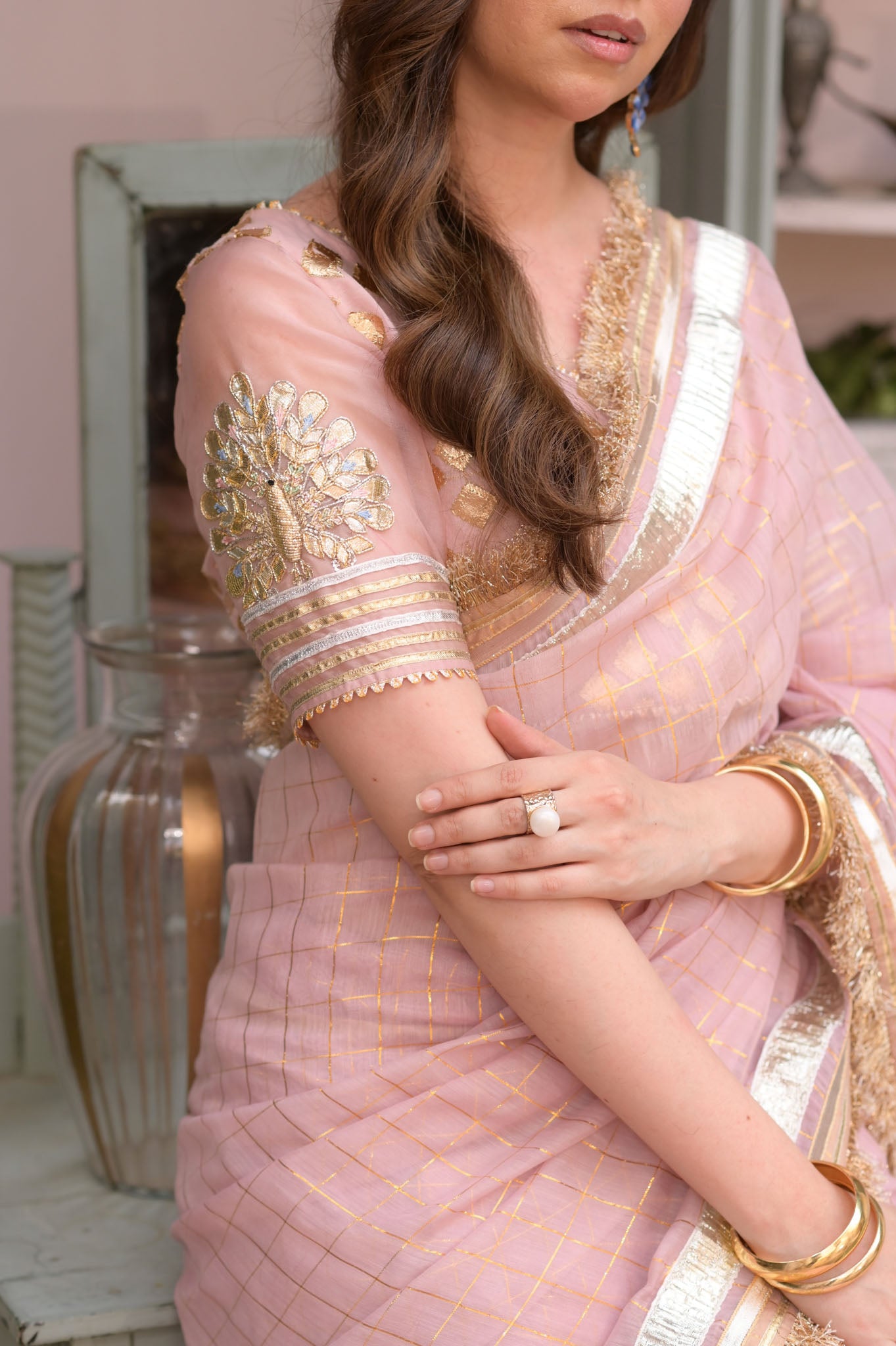 Artisan's hand embelished and pani work blouse paired with zari paper cotton sari enhanced with indian lappas and suchi kiren.