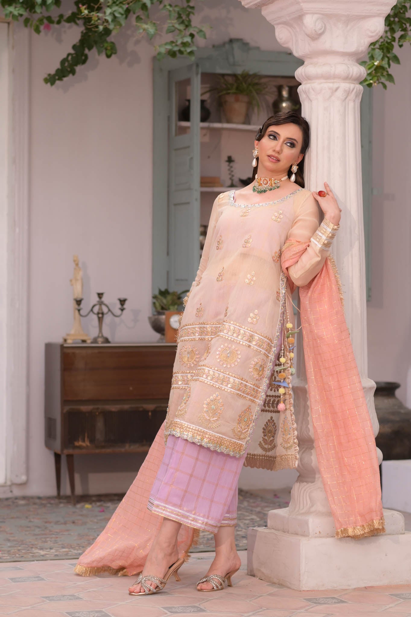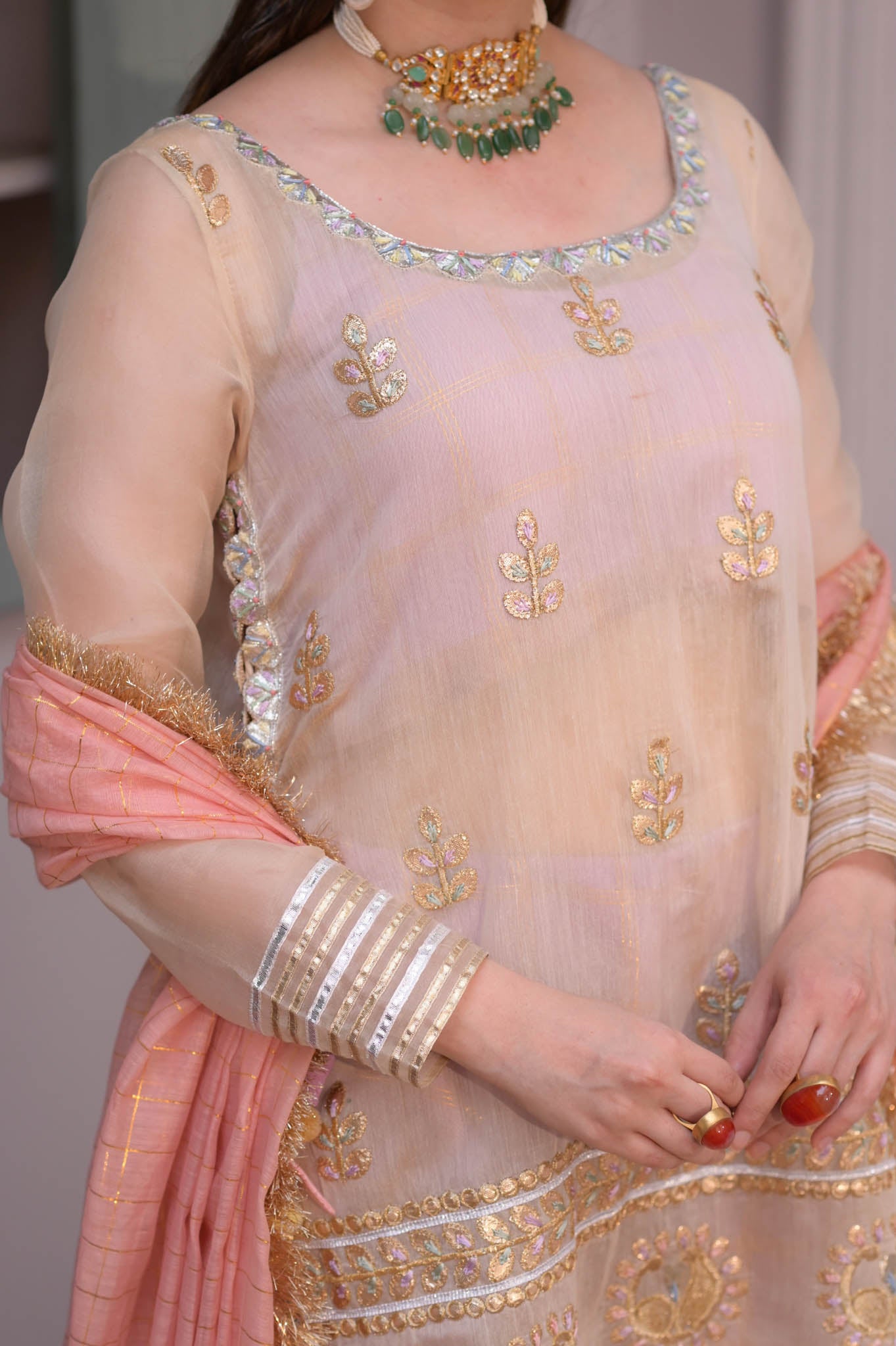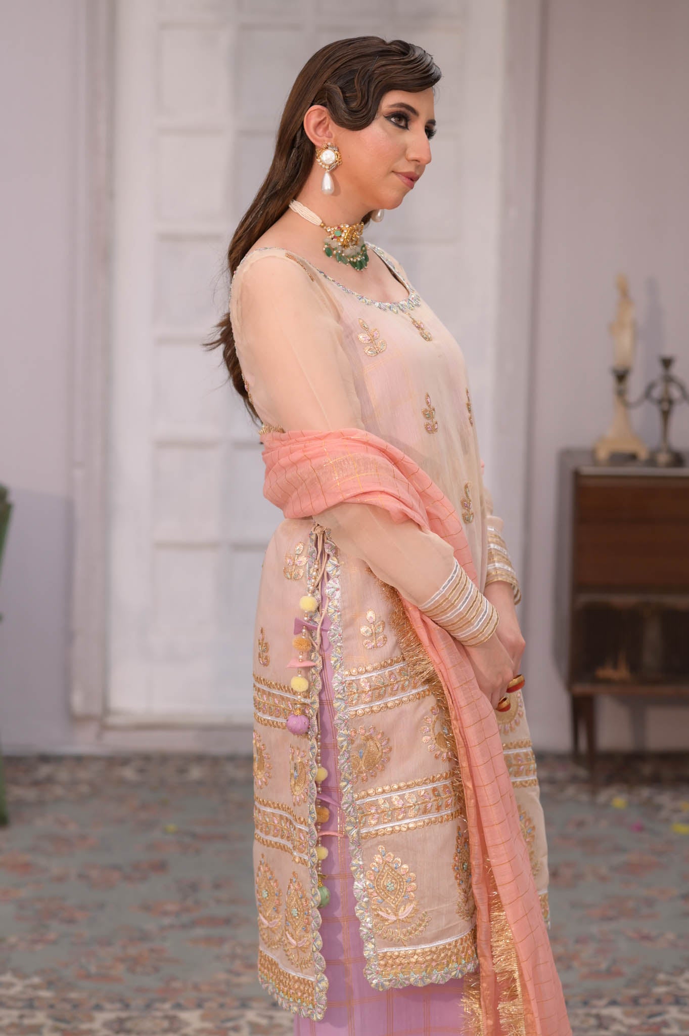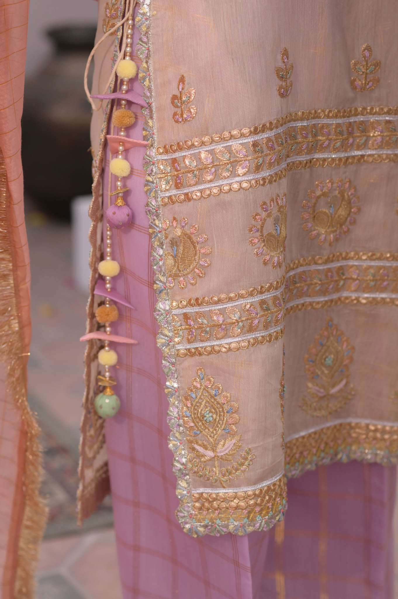 Indian pani shirt enhanced with gota, resham and hand made tassels. Azaar and dupatta adorned with indian lappa and suchi kiren.