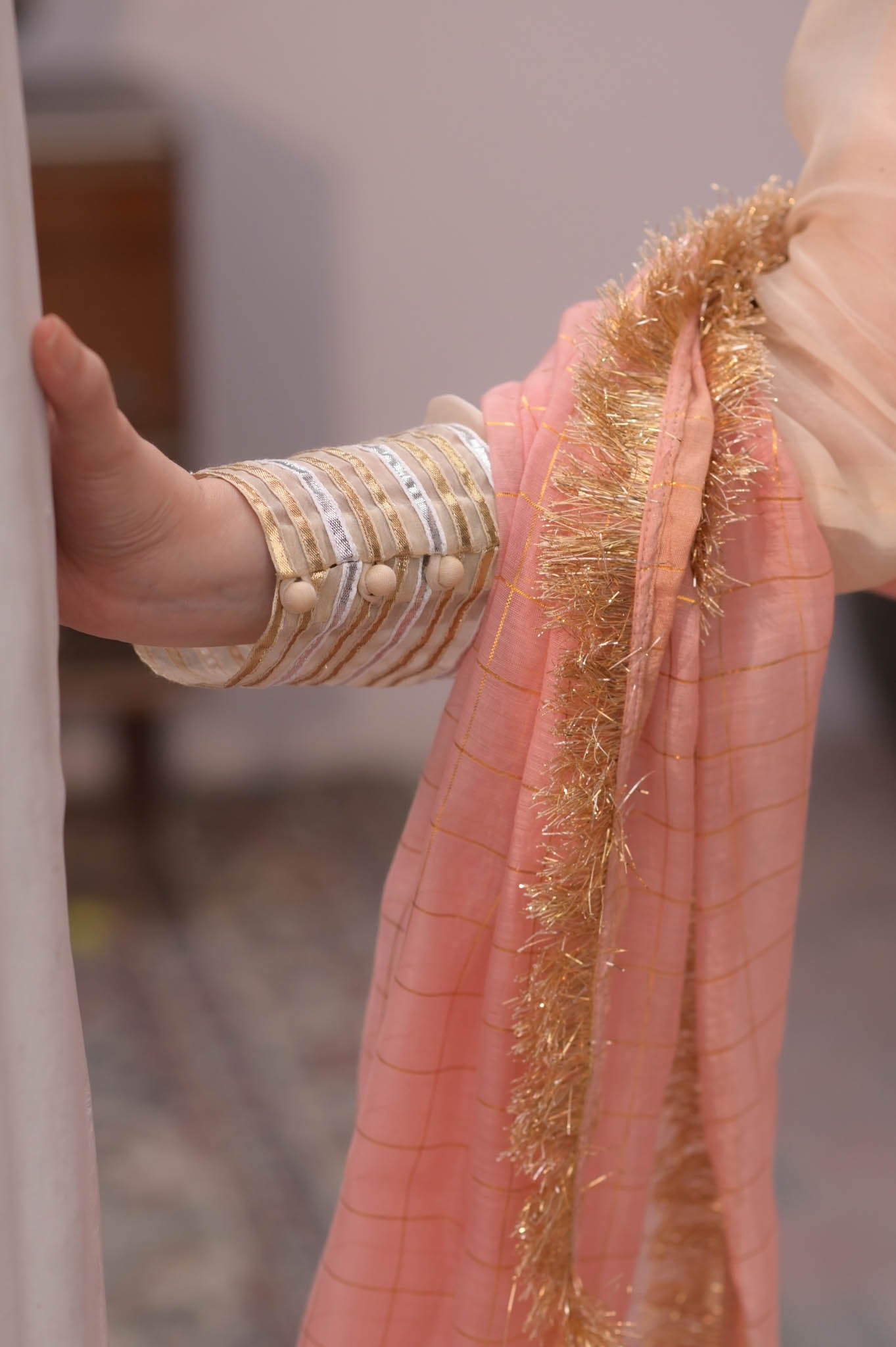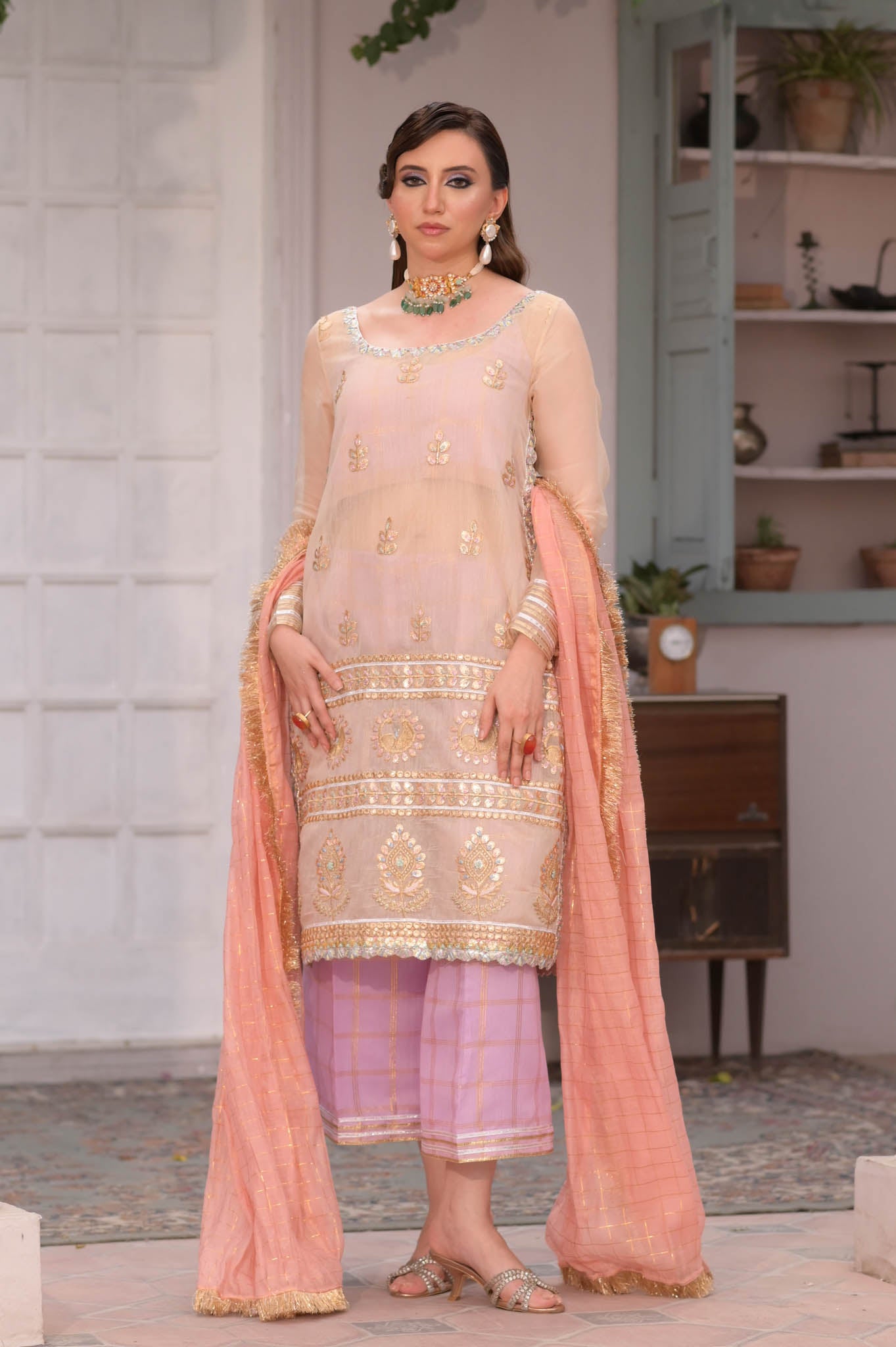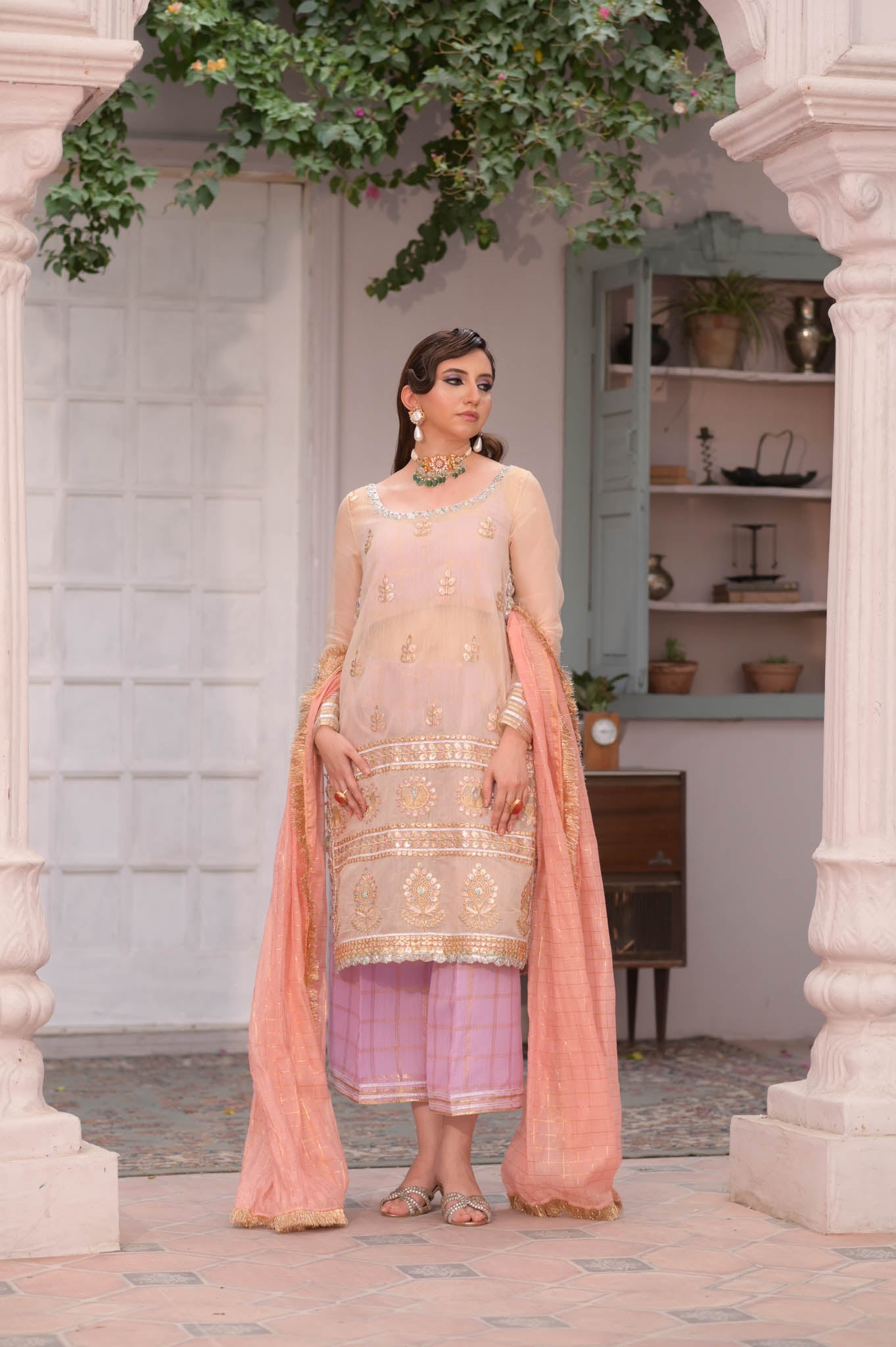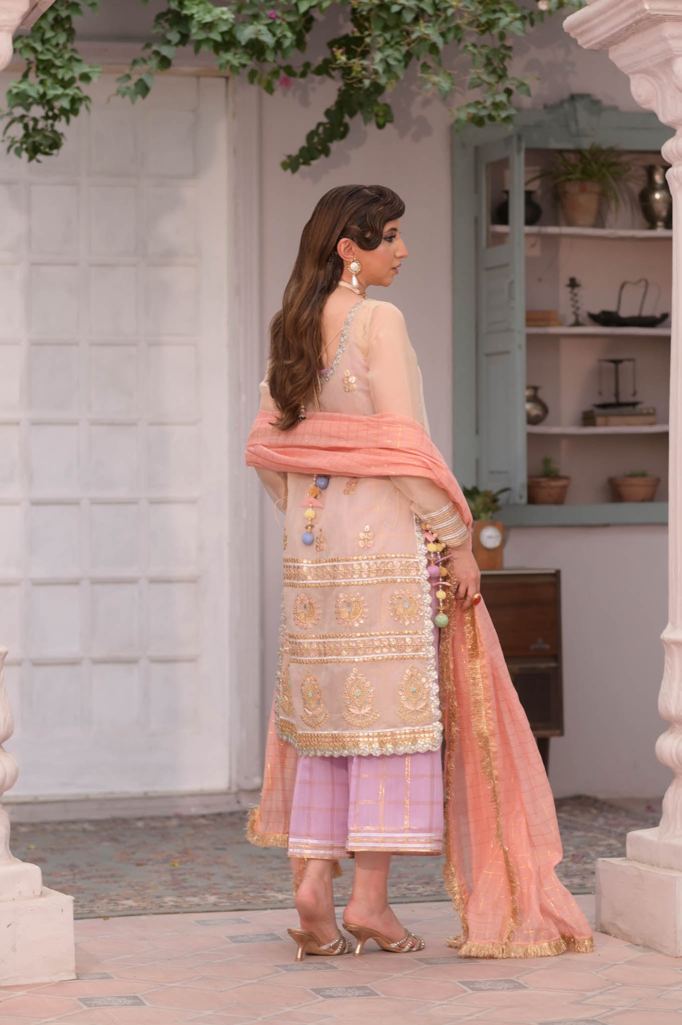 Indian pani shirt enhanced with gota, resham and hand made tassels. Azaar and dupatta adorned with indian lappa and suchi kiren.