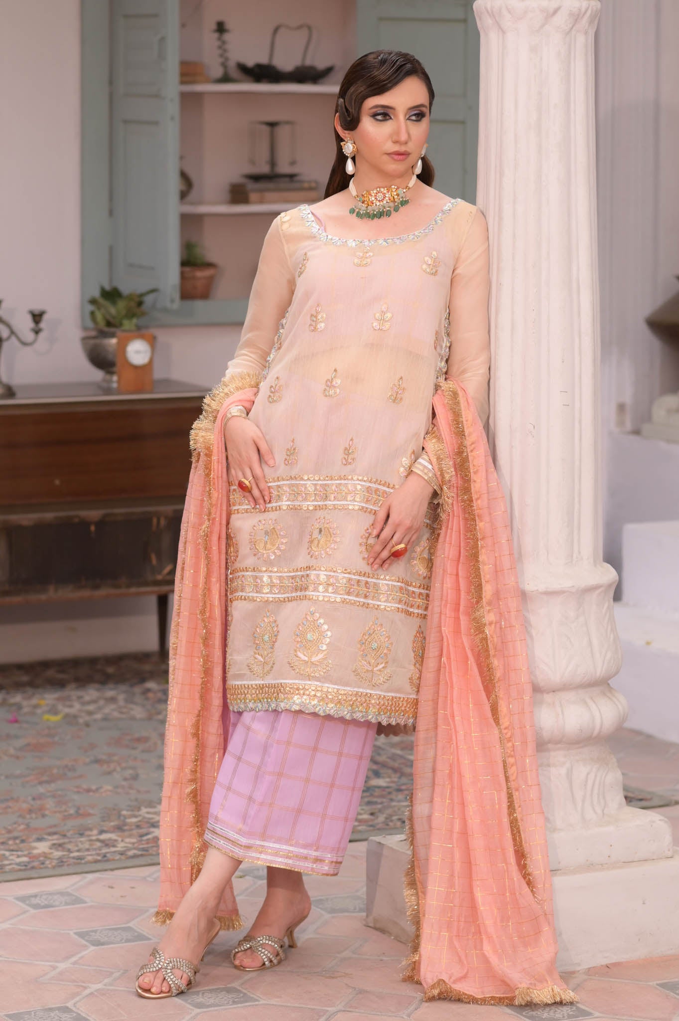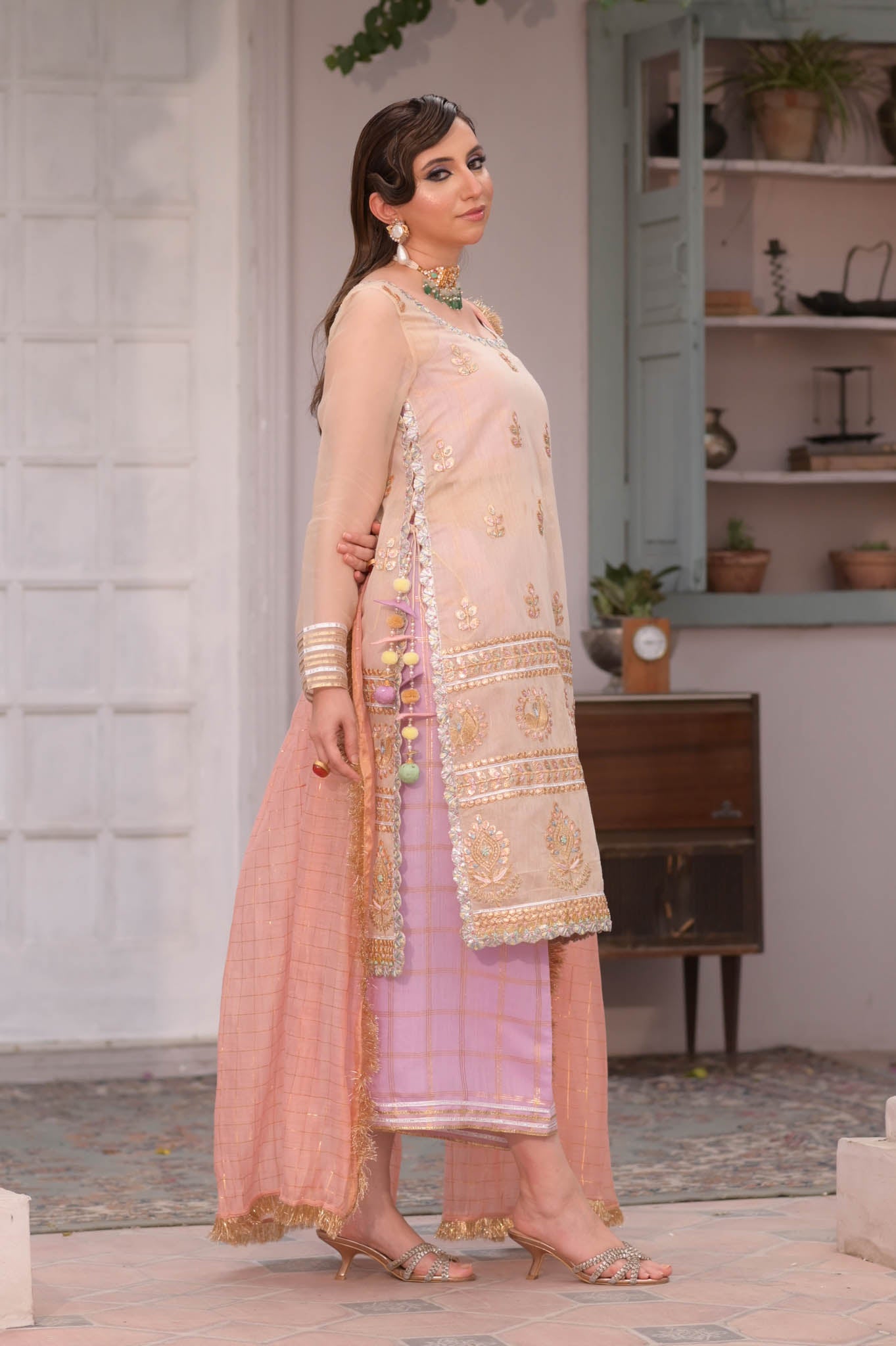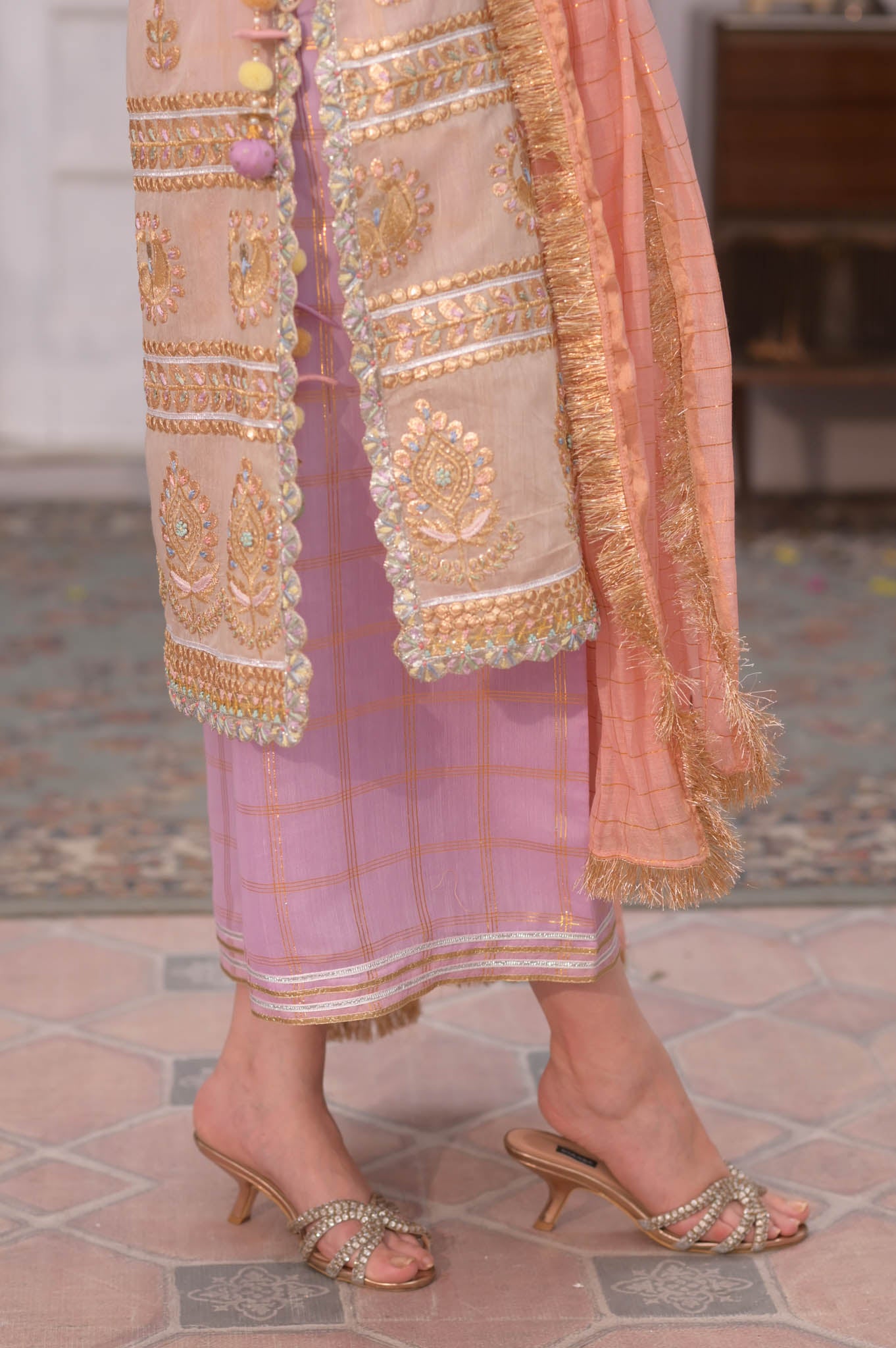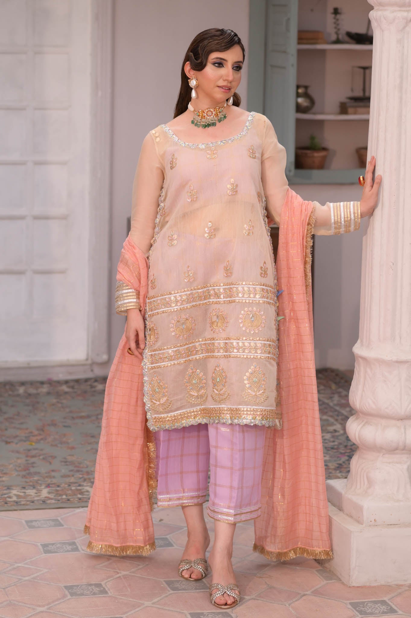 Indian pani shirt enhanced with gota, resham and hand made tassels. Azaar and dupatta adorned with indian lappa and suchi kiren.