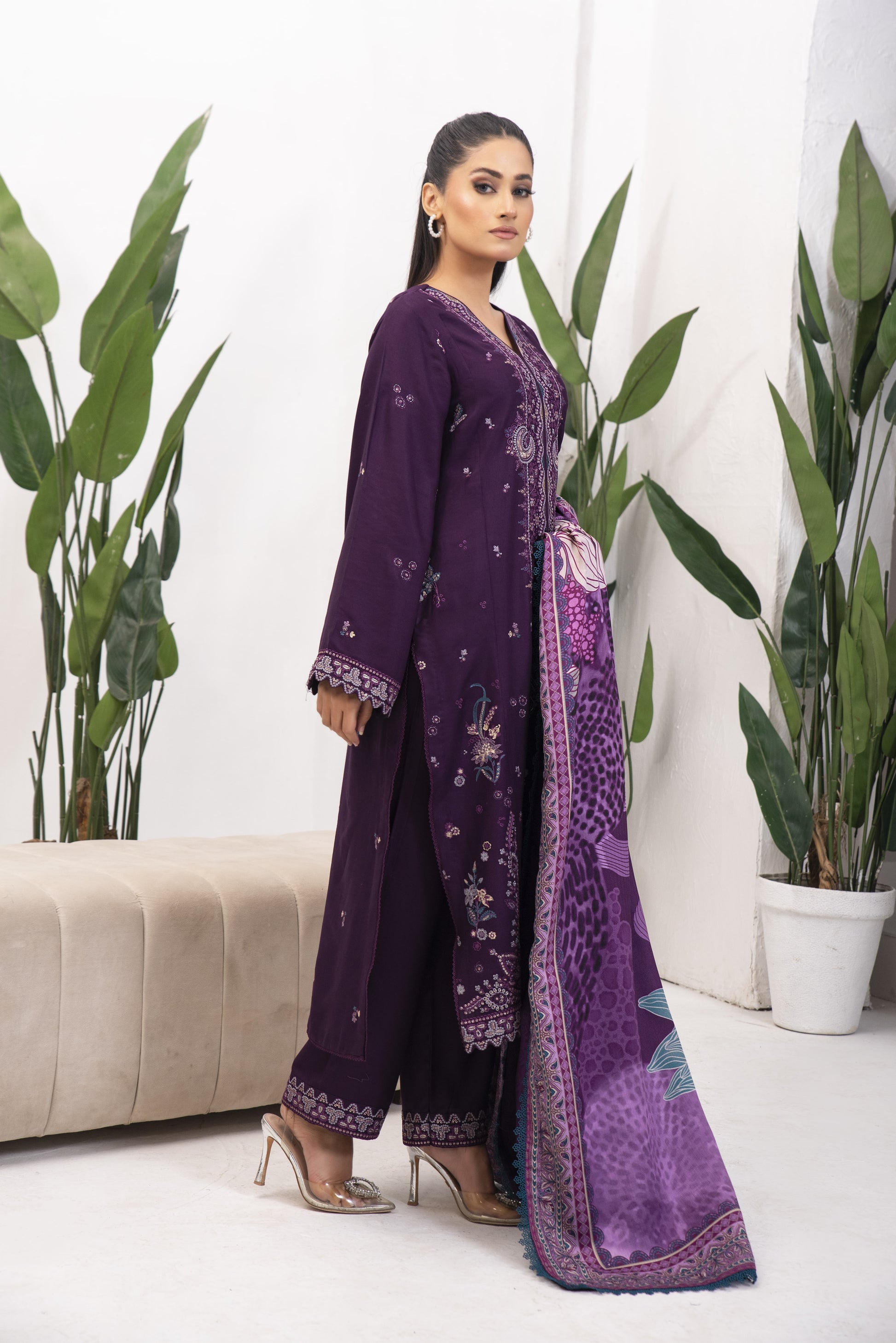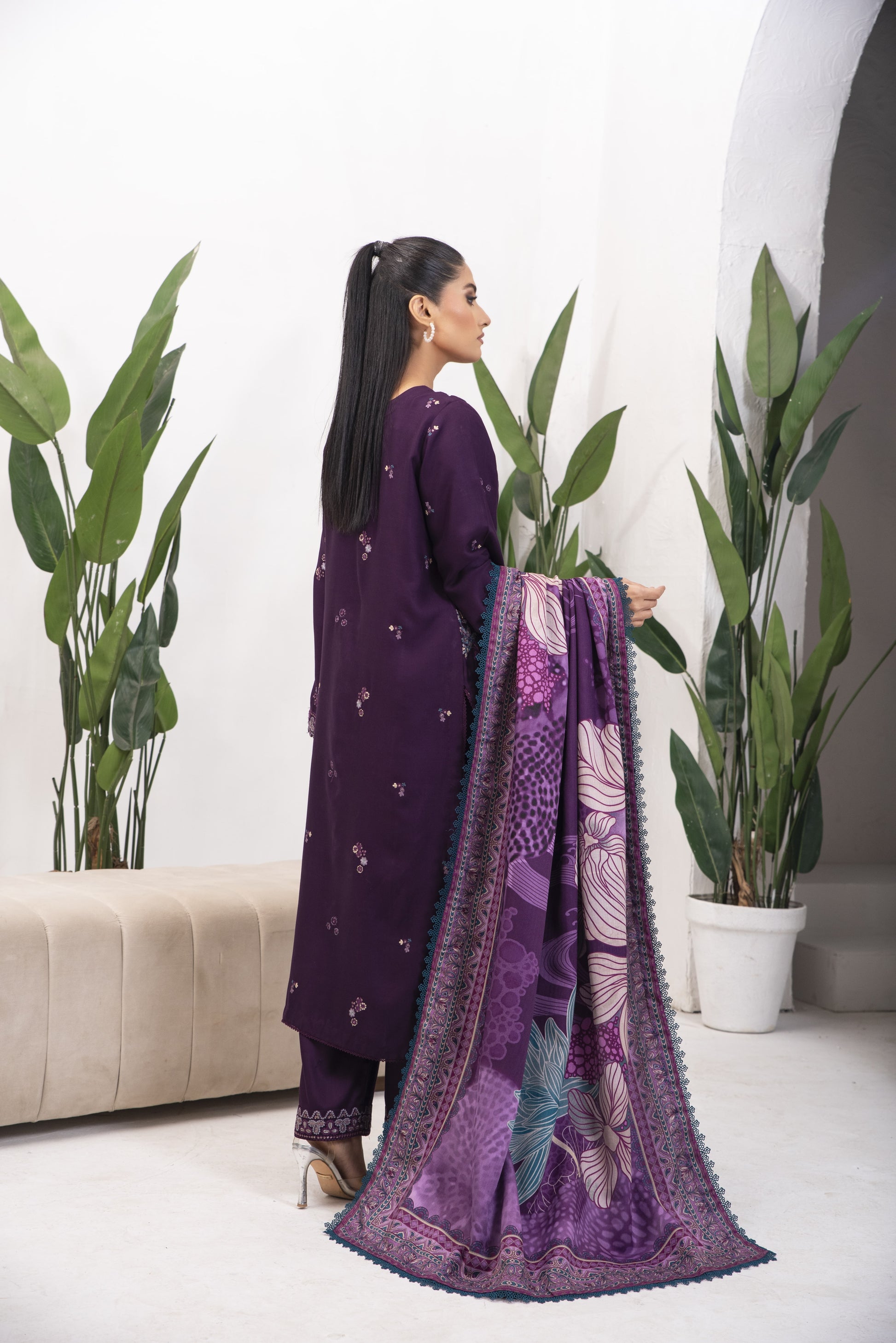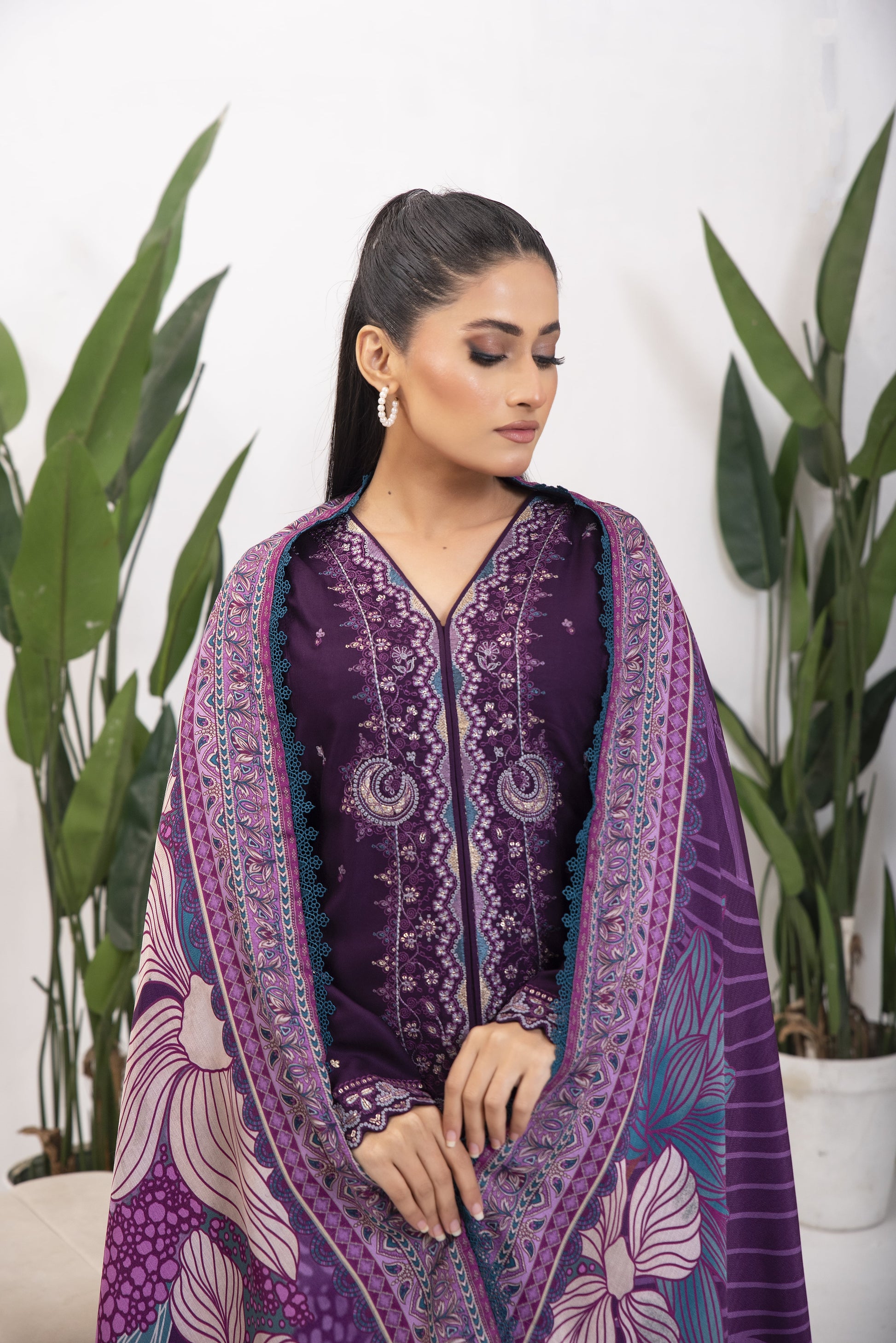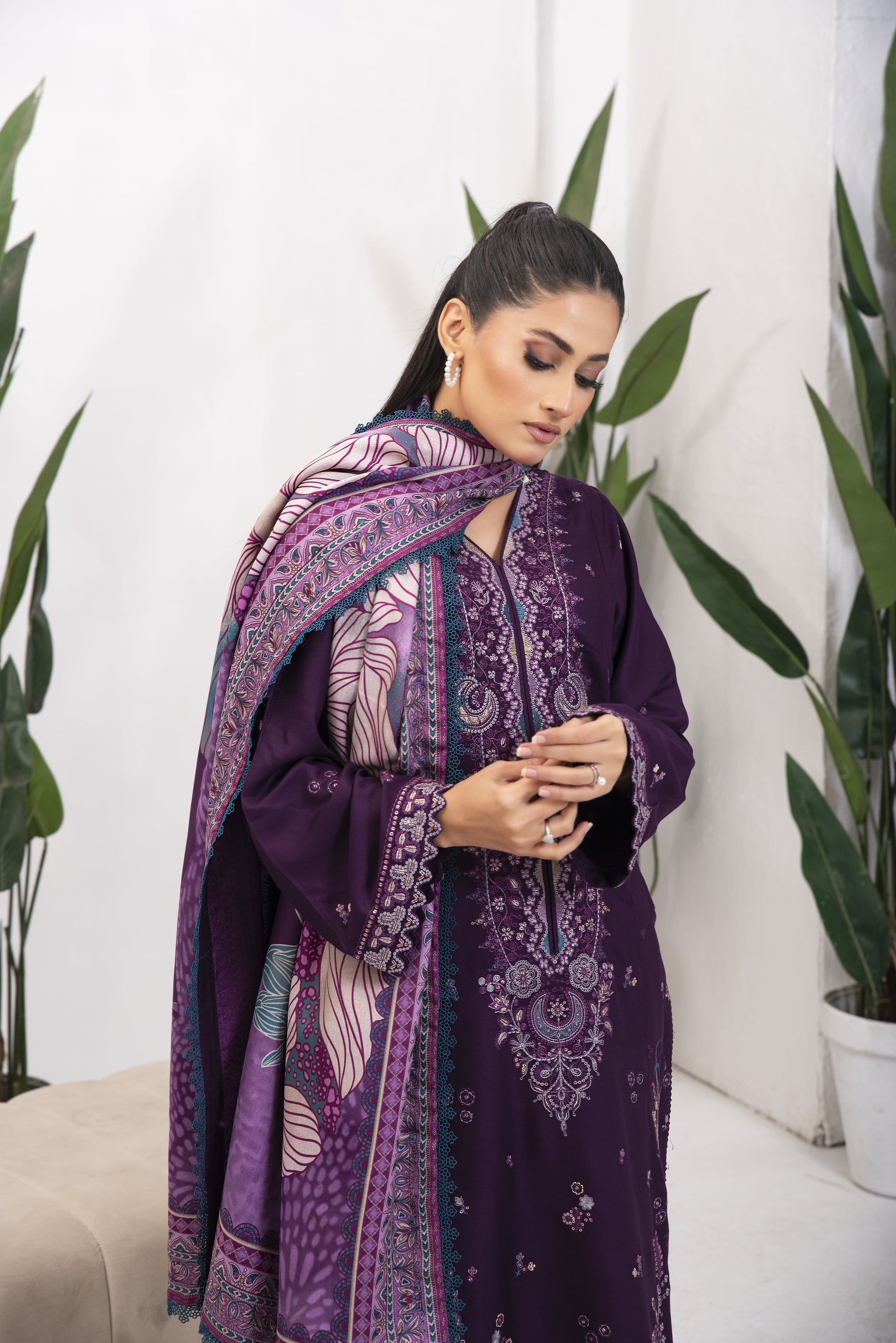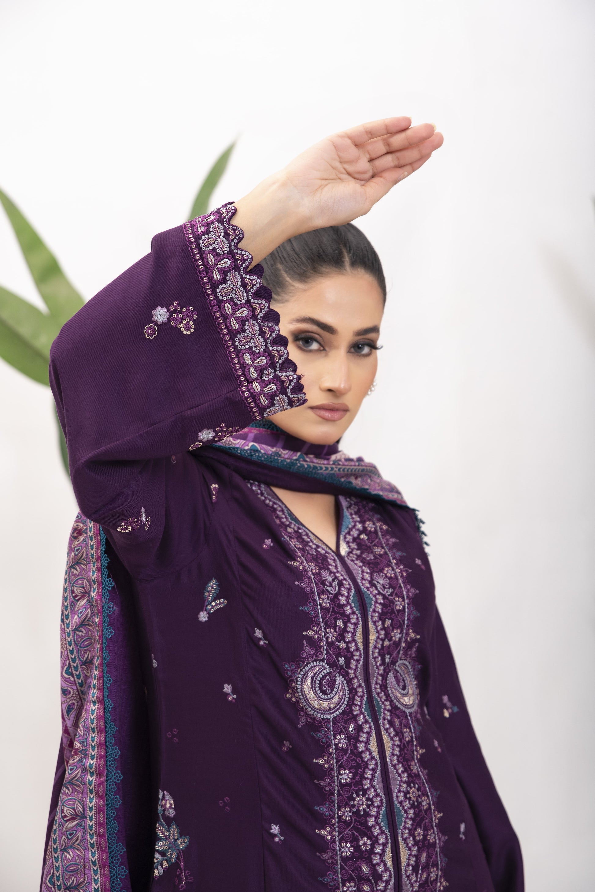 Camile's purple hue is elegantly crafted with lillies themed embroidery, harmonious blend of lilacs, pinks, greys and zinc. With a touch of gold tilla and sequence on the warm twil, finished with scallop borders on the sleeve and cullot. The pattern of lotus leaves is depicted on the canvas of the shawl, heavily composed digital printed borders making this piece a regal choice.